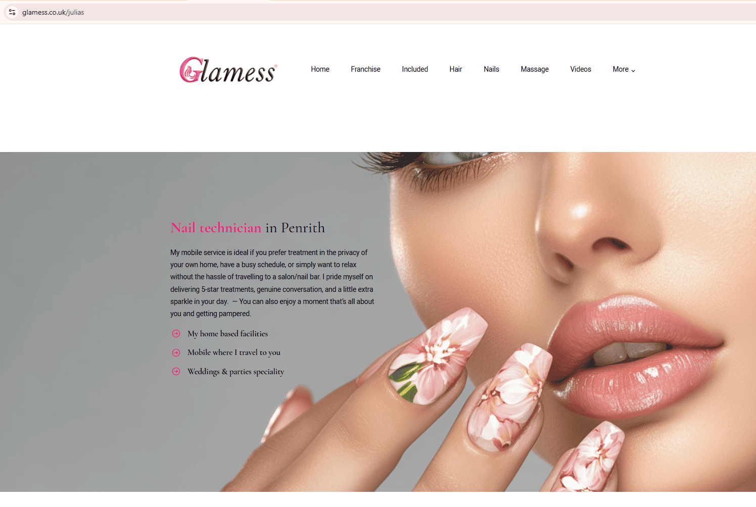 Your very own professional GLAMESS web page www.glamess.co.uk subdomain web address. See Julia Smiths webpage example below. On your web page etc, we will display the specific areas you want to work in + services etc.